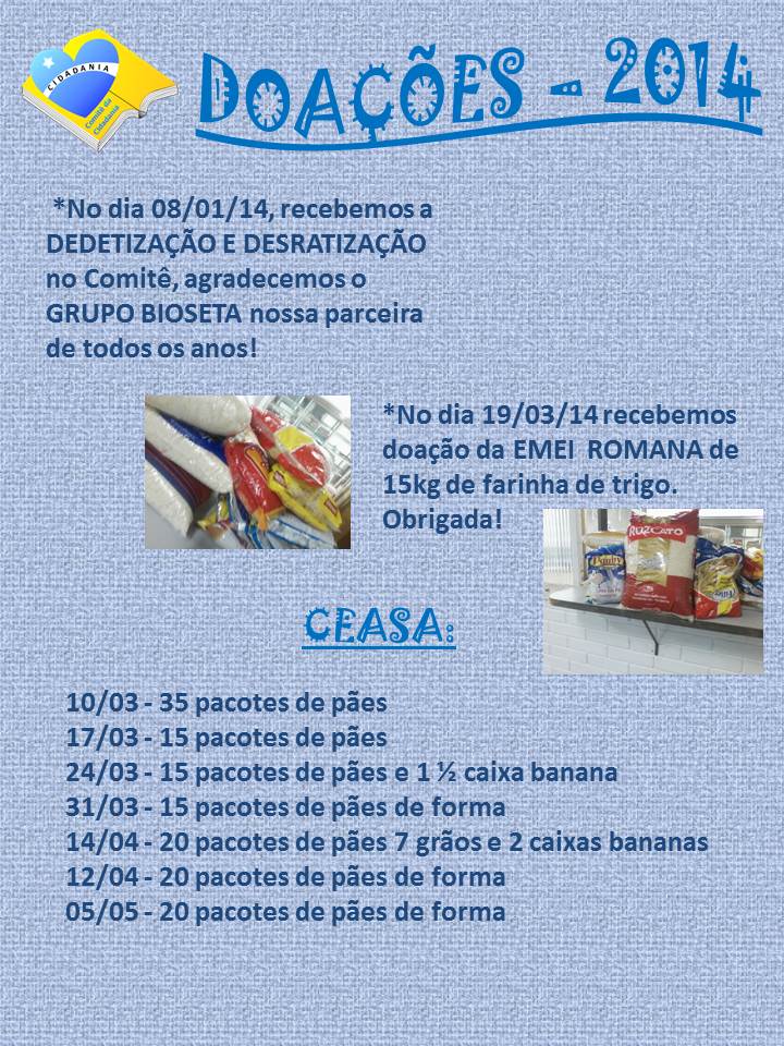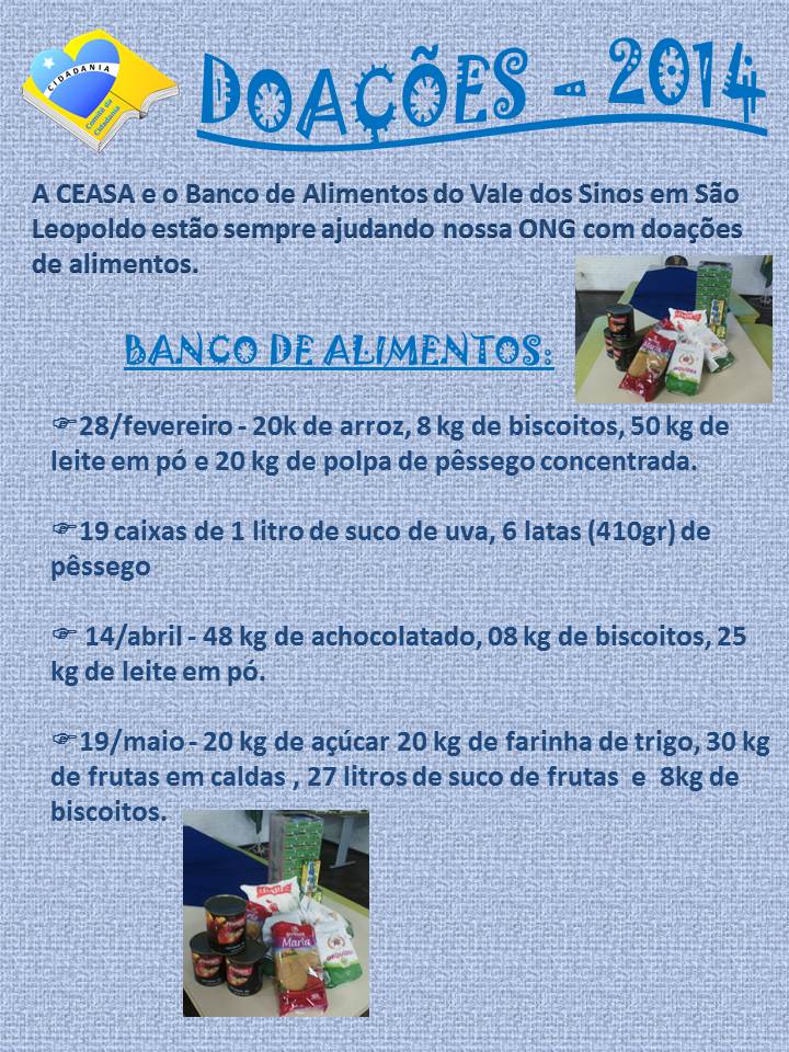 Para visualizar as doações que recebemos este ano, acesse nossa página www.facebook.com/pg/comite.cidadania.sapucaiadosul/photos/?tab=album&album_id=1338535539564075
